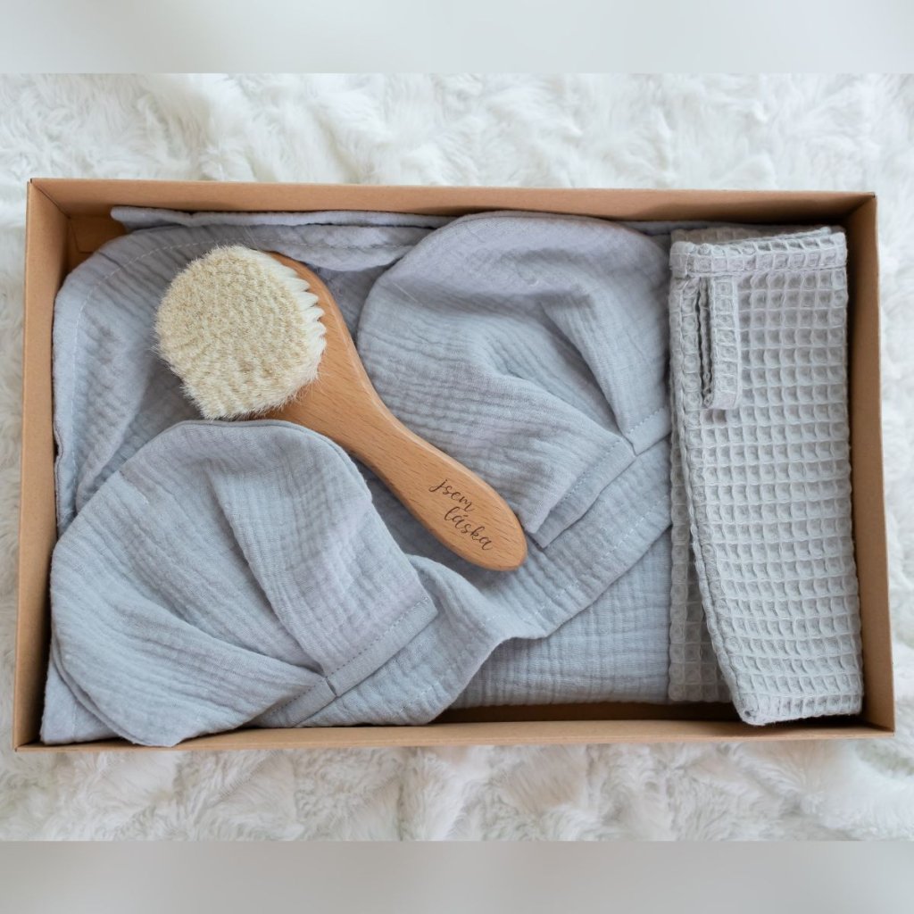 „Jsem láska“ šedý set – kojenecký dřevěný kartáč na vlásky, osuška a žínka
