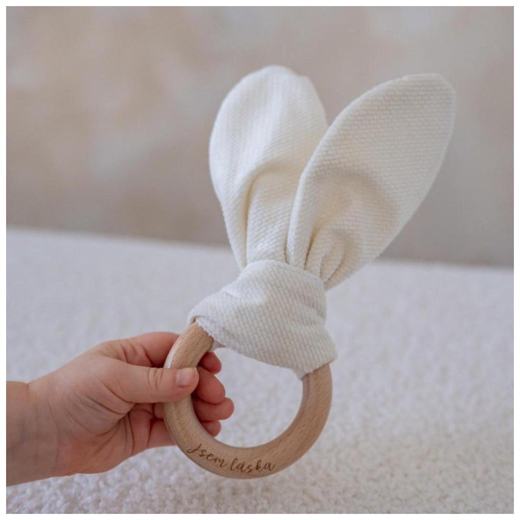Dřevěné kousátko je do hladka vybroušené, bezpečné a poslouží jako záchrana při růstu prvních zoubků a bolesti dásní. Kousátko je ušito se šustícím papírem uvnitř látky, samotná látka velvetu je na dotek velice příjemná, hebká a garantujeme, že každé miminko nedá tuto hračku z ruky pryč :-)