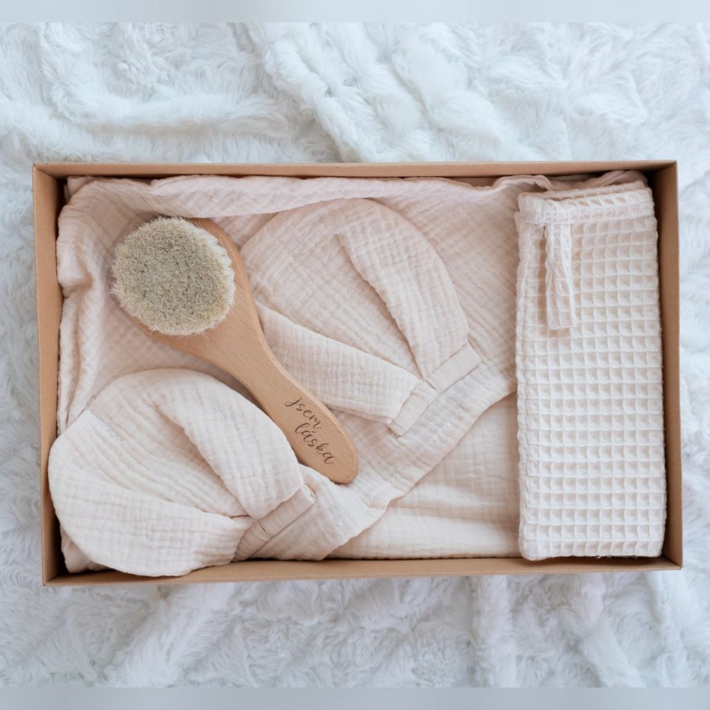 Mušelínová osuška s oušky medvídka, kterou využijete po každém koupání, a nebo v létě u vody, sladěná žínka do sady se savou vaflí a na závěr to nejlepší - kojenecký dřevěný kartáč s jemnými štětinkami z kokosového dřeva s naším autorským gravírovaním "jsem láska", která se oblíbí každé miminko - a to my víme!