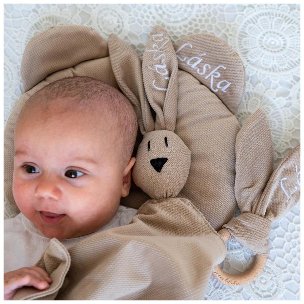 „Jsem láska“ je kolekce, kterou pro vás šijeme skutečně s láskou. Tento set laděný do béžové barvy je ideálním dárkem pro novorozené děťátko a díky své praktičnosti potěší každou maminku. Dřevěné kousátko je do hladka vybroušené, bezpečné a poslouží jako záchrana při růstu prvních zoubků a bolesti dásní. Podhlavník funguje jako stabilizační ergonomicky tvarovaný polštářek, který pomáhá udržet hlavičku miminka ve správné poloze a zabraňuje jejímu zploštění. A třetici doplňuje usínáček, tulivá hračka a nepostradatelný kamarád ve tvaru zajíčka, který bude miminku dopřávat pocit pohody a bezpečí.