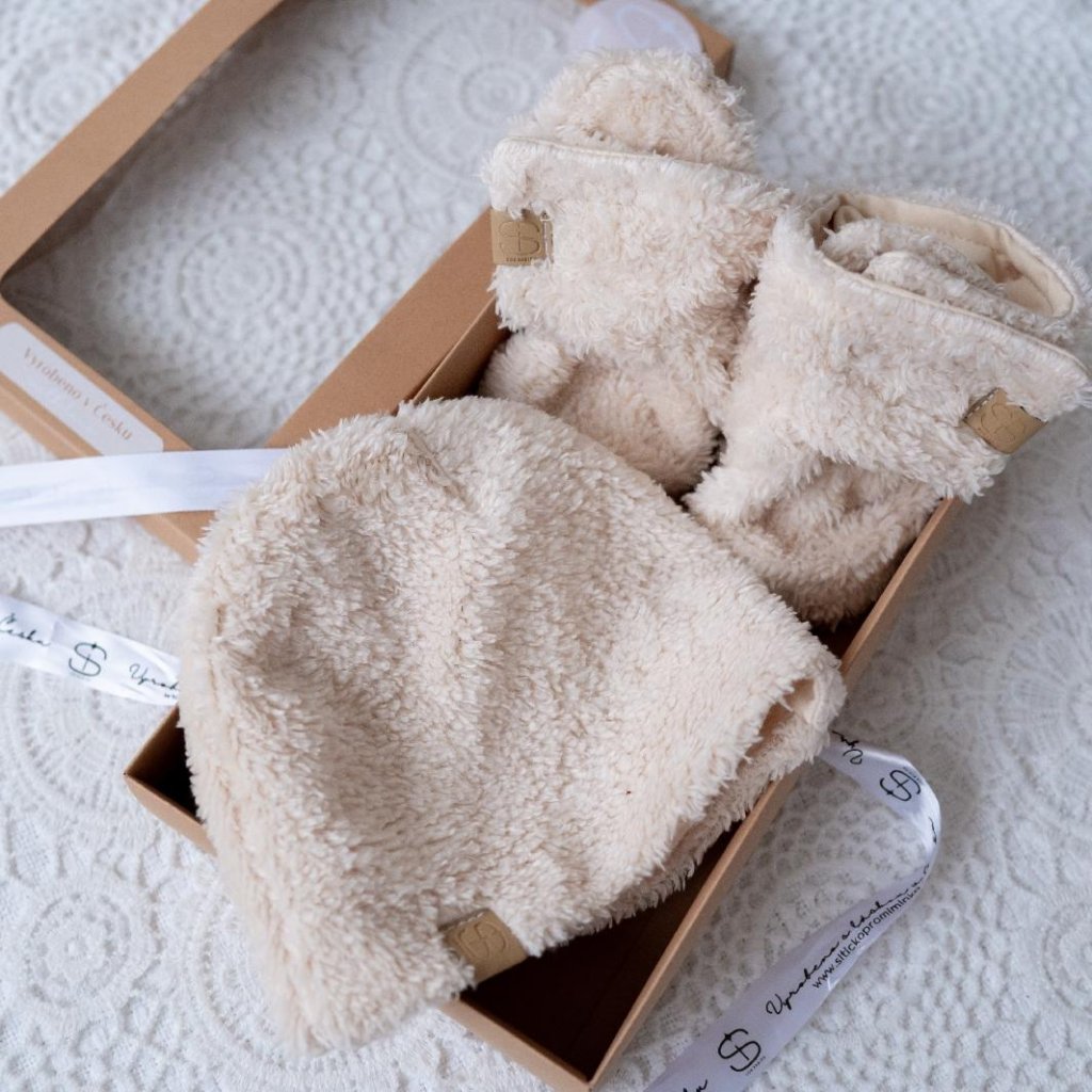 Velké teplíčko, pocit spokojenosti a klidu hned od narození, to jsou naše capáčky s čepičkou v dárkovém setu z heboučkého beránku.