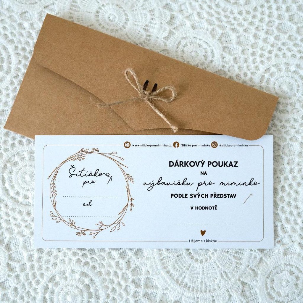 Dárkový poukaz je skvělým dárkem pro novopečené rodiče nebo těhotnou kamarádku, kterým tak dáváte možnost vlastního výběru ze všech našich produktů. Sami si tak vyberou, které věci se jim budou hodit do výbavičky pro jejich miminko. Věřte, že to jim udělá obrovskou radost a vždy, když budou své miminko balit např. do zavinovačky nebo dávat do hnízdečka pořízeného díky poukazu od vás, vždy si na vás s láskou vzpomenou.