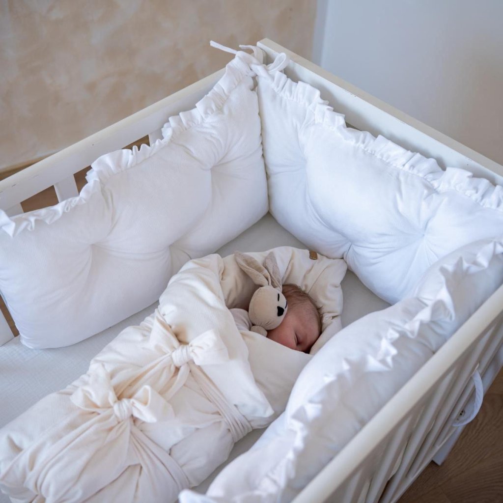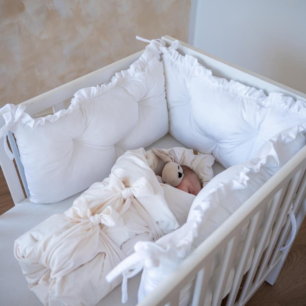 Luxusní prošívaný mantinel do postýlky s volánem bílý velvet 35x60cm