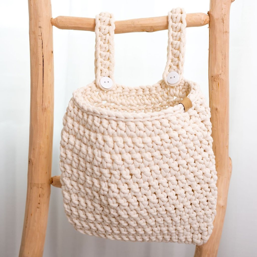 Dopřejte si krásný kapsář, který je praktický nejen na postýlku, ale kamkoliv, kde potřebujete mít. Díky pevné přízi kapsář krásně drží svůj tvar, je vhodný na pleny, ubrousky a další nepostradatelné věci pro miminko.