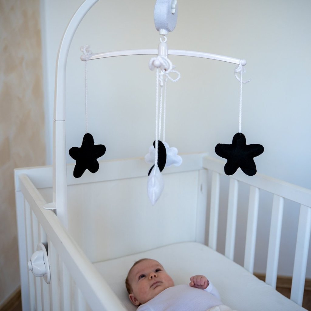 Kontrastní hrací kolotoč nad postýlku černo-bílé hvězdy a měsíc