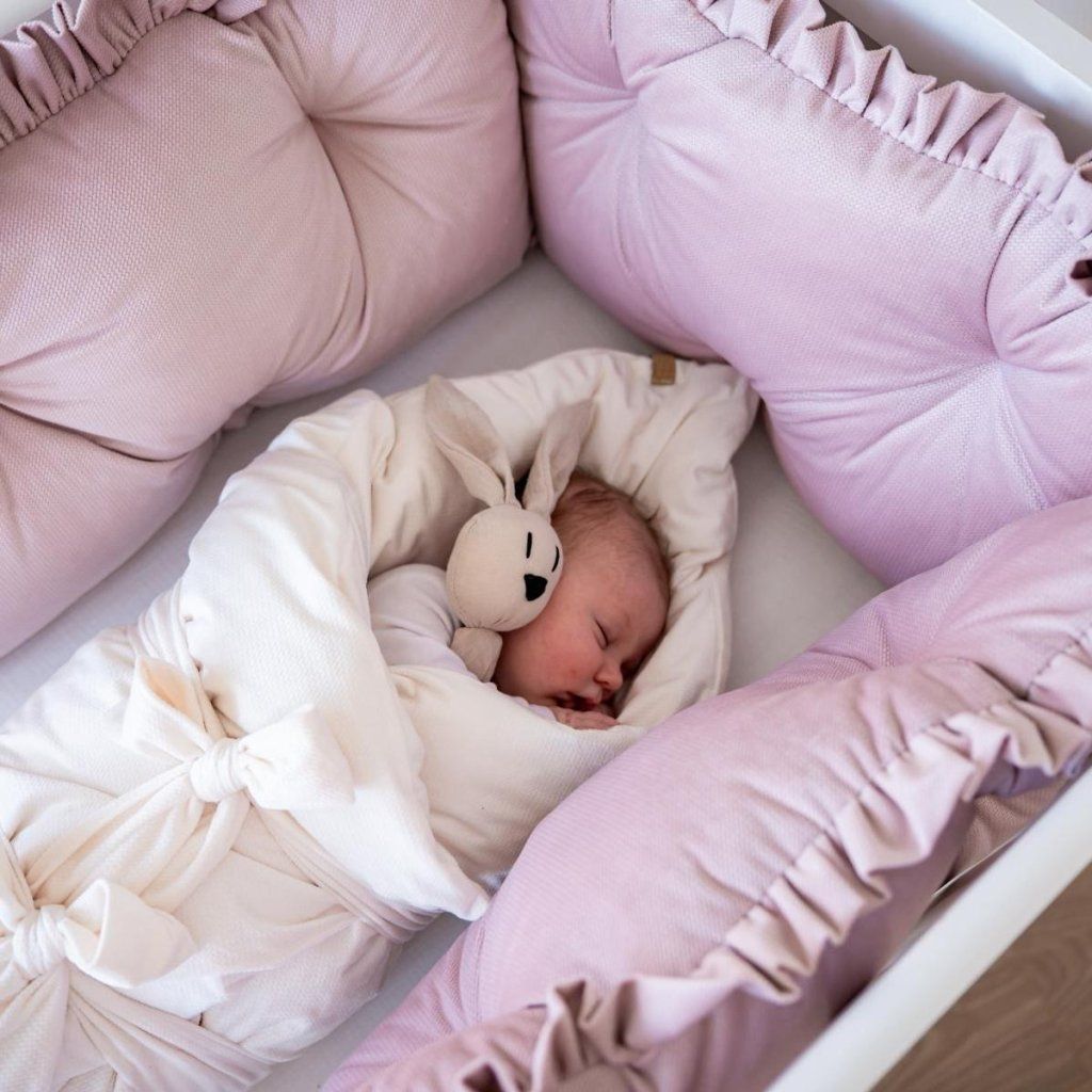 Luxusní prošívaný mantinel do postýlky s volánem pudrový velvet 35x60cm