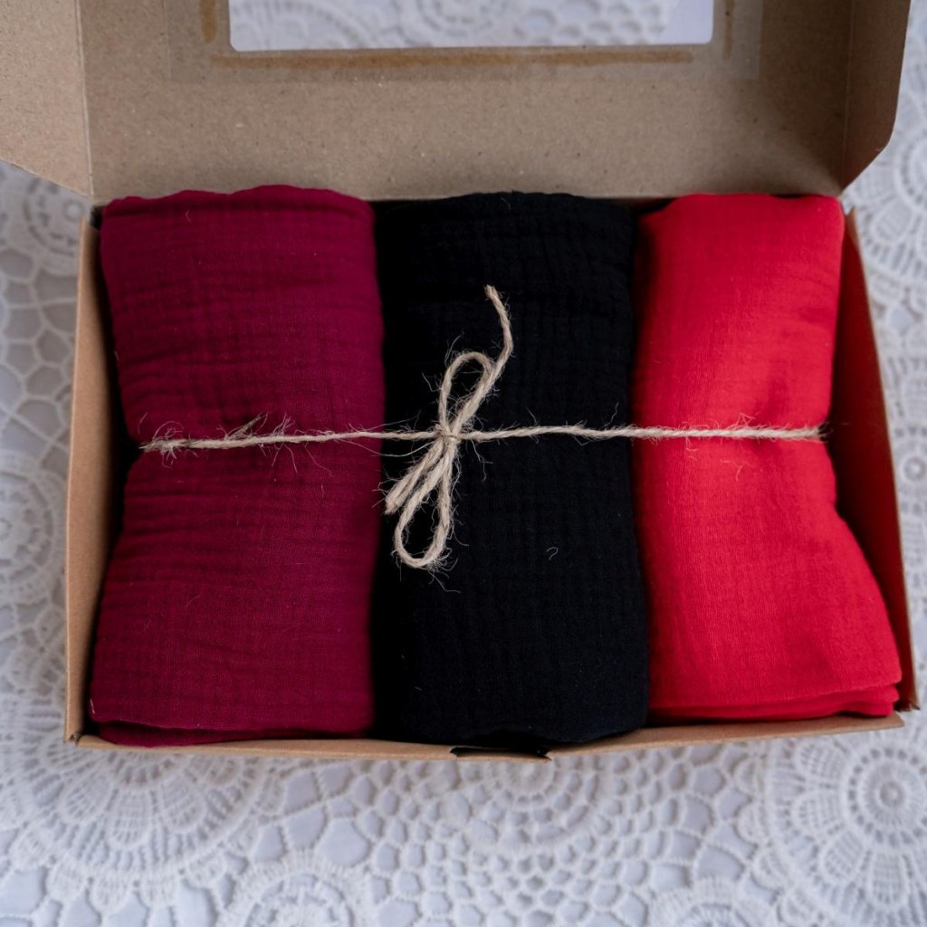 Mušelínový set kontrastních plen, které jsme vytvořili s naší autorskou látkou puntíku, doplněnou o odstíny tmavě šedé a tmavě cihlové. Tyto barvy jsou pro miminko od narození prvním smyslem vnímání kontrastních barev, které je schopno rozpoznat a pomáhá mu se cítit bezpečně v prvních dnech na tomto světě.