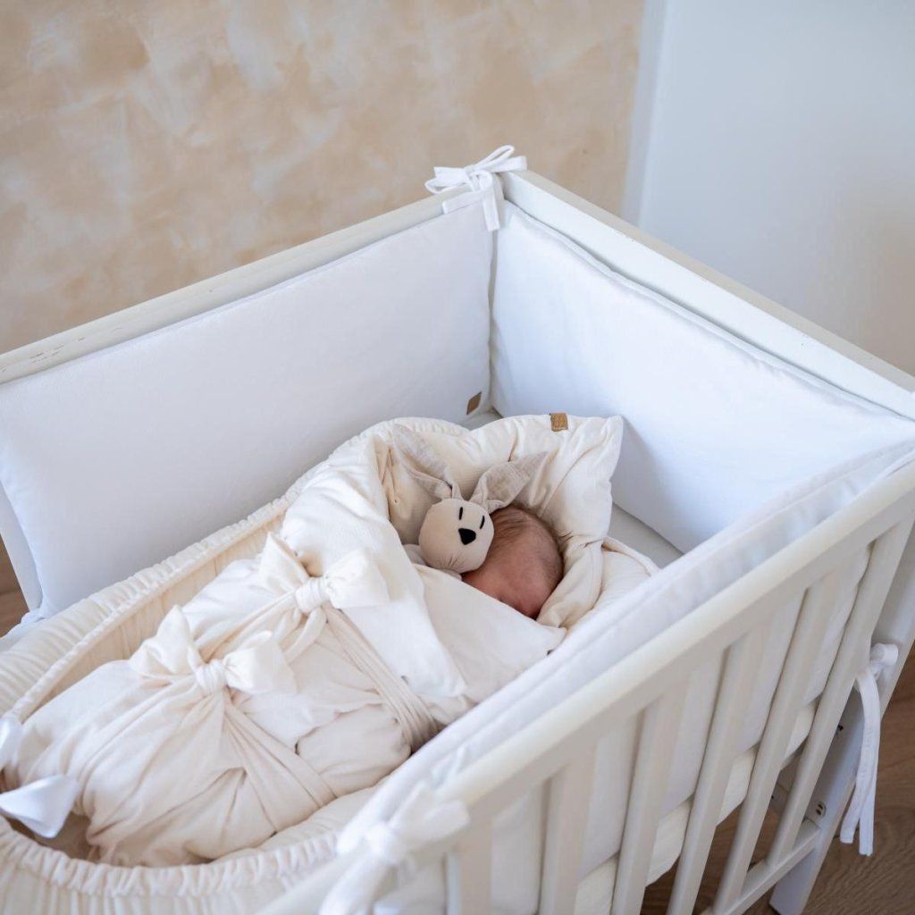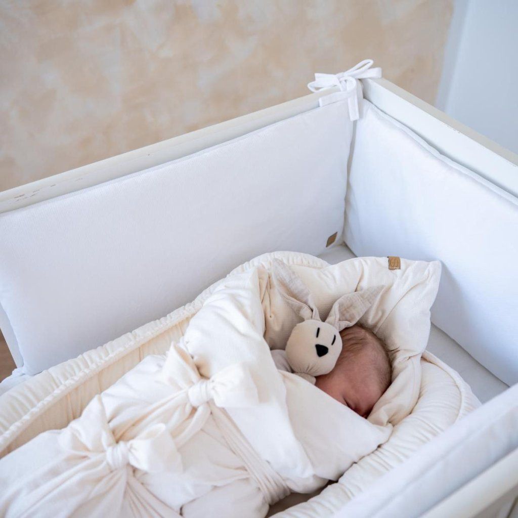 Plochý bílý mantinel do postýlky vytvoří v postýlce měkké hranice a zajistí tepelný komfort během jakékoli roční doby.