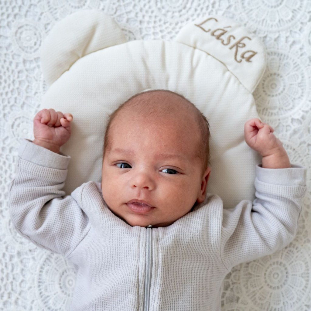 Roztomilý ergonomicky tvarovaný polštářek pro vaše miminko s vyšitím "láska".