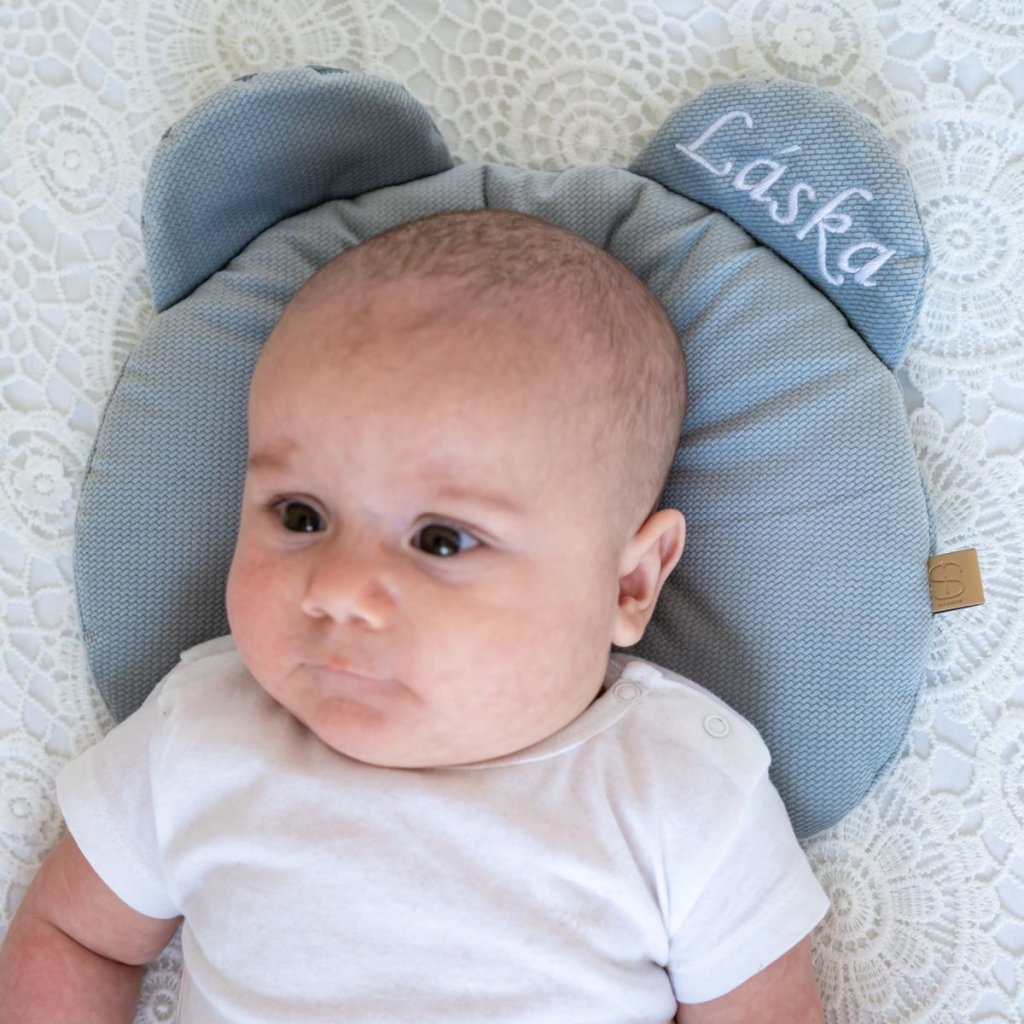Roztomilý ergonomicky tvarovaný polštářek pro vaše miminko s vyšitím "láska".