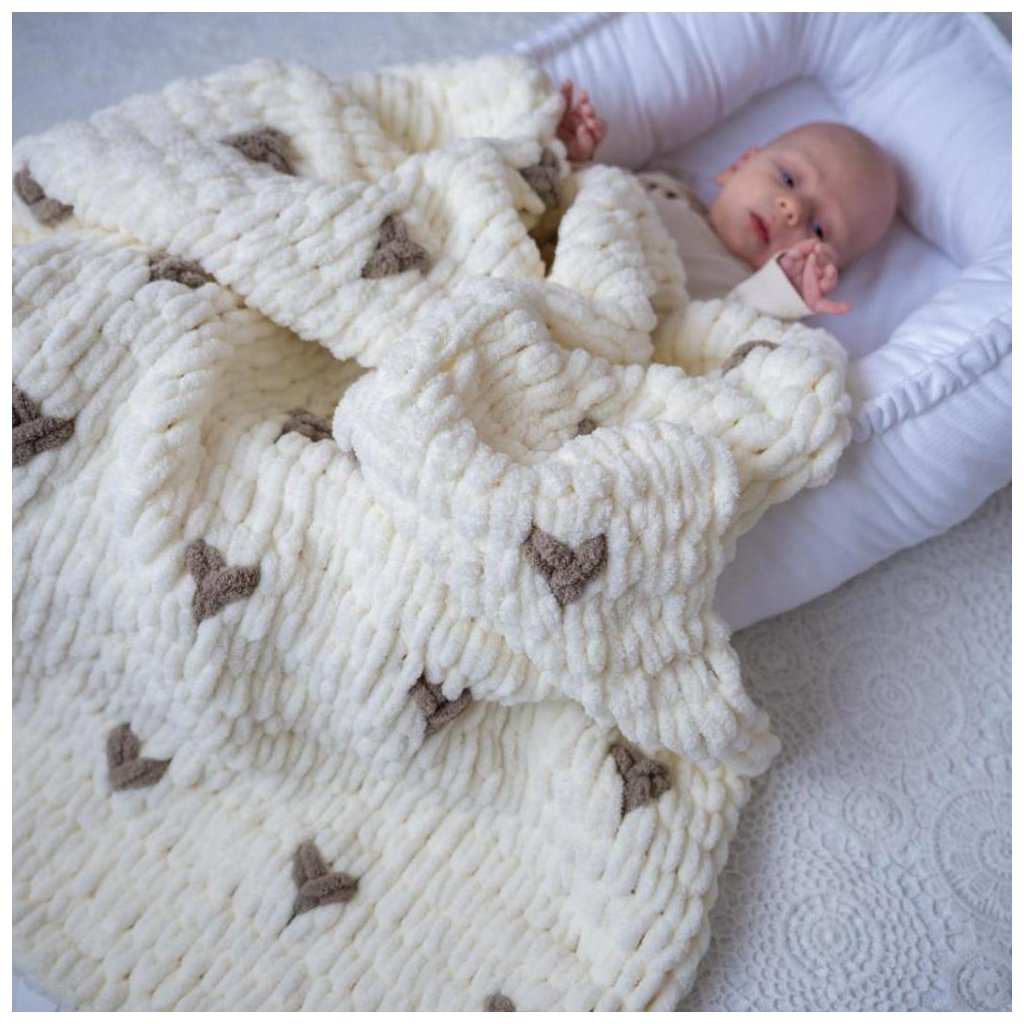 Ručně pletená 100% puff deka smetanová se srdíčky