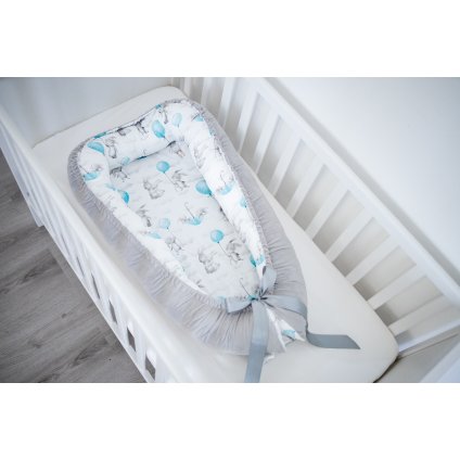 Stabilizačný vankúšik v tvare krídel z našej originálnej látky Blue Balloon pomáha udržať hlavičku...