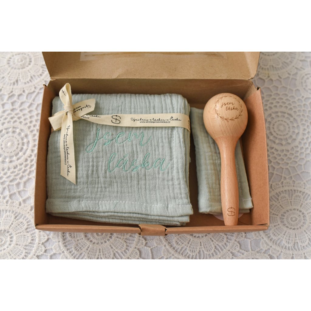 Darčekový balíček„Jsem láska“ mätová zelená plienka s výšivkou a rumba gule + zadarmo mini plienka