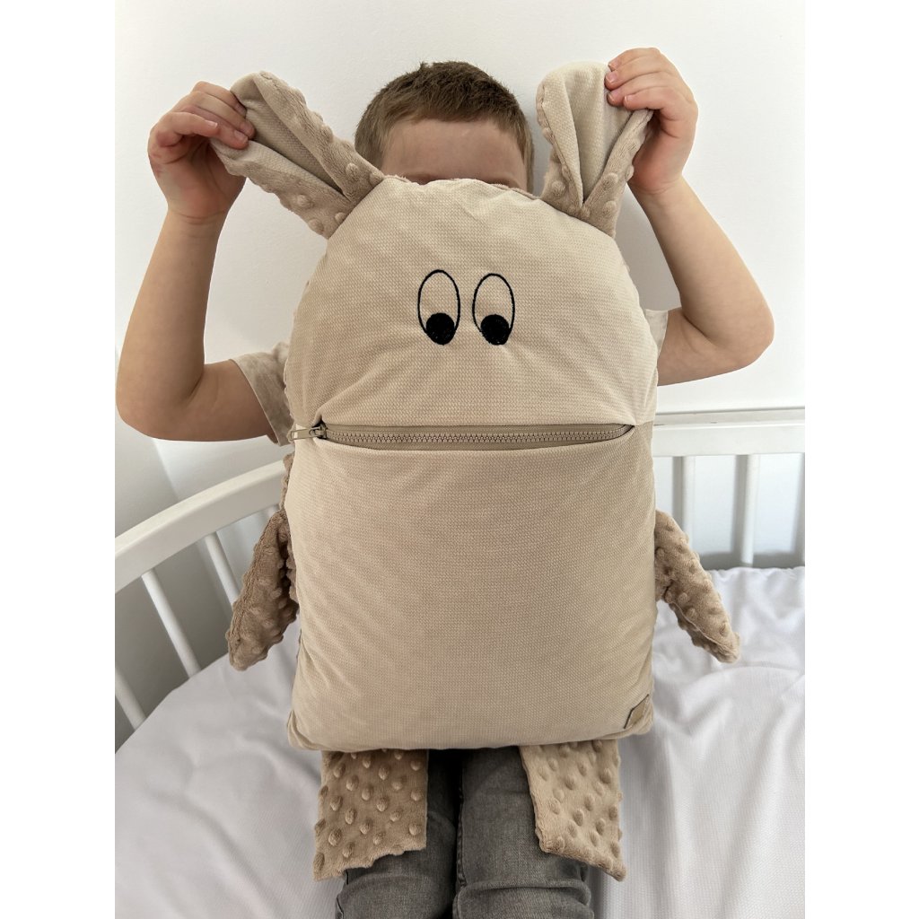 Náš pyžamožrút je ušitý naozaj na mieru tak, aby sa mu do papuľky, kde je našitý kostený zips pre skutočnú bezpečnosť detí (nepoškriabe a je hladký), zmestil nielen jeden kus detského pyžamka. Je ušitý z látok príjemných na dotyk - v zaručenej kombinacii velvetu a hebkej minky.