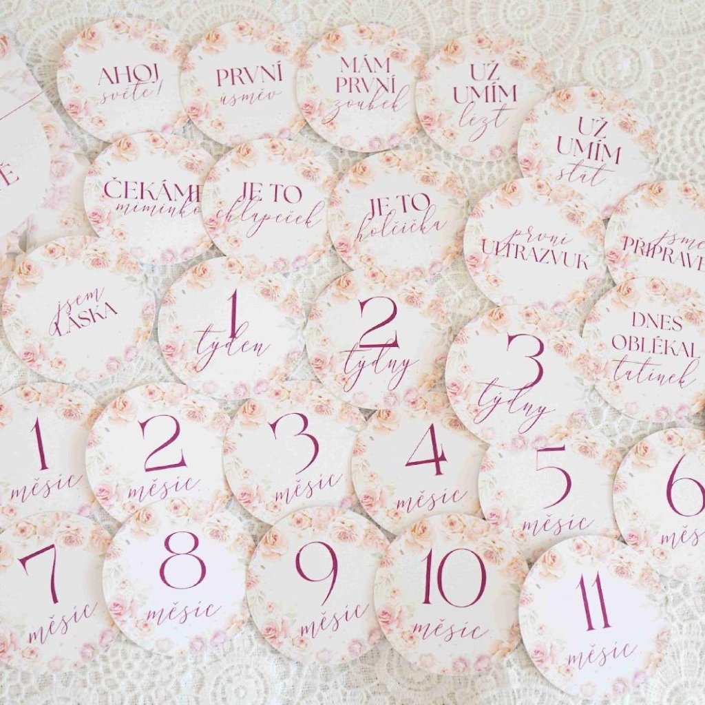 Autorské vzory z našich látok sme preniesli na papier a vznikli z toho bezkonkurenčné okrúhle míľnikové kartičky, ktoré využijete pred pôrodom, ale hlavne po pôrode. Text sme vymysleli tak, aby maximálne vystihoval životné situácie a spomienky, ktoré si na fotkách chcete uchovať a spomínať.