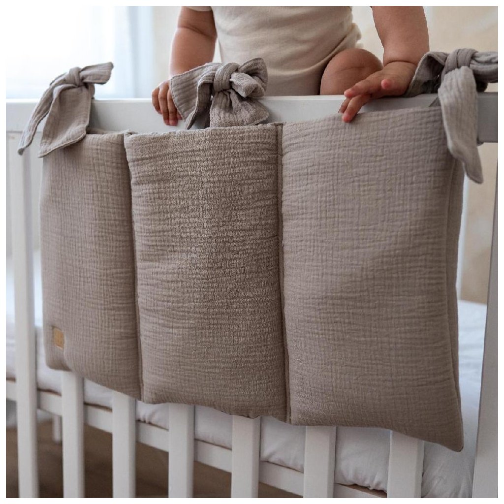 Organizér oceníte na maličkosti ako je cumlík alebo krém, plienku alebo lahvičku, neskôr aj na pyžamko a spinkáčika. Navyše dokonale zútulní celú postieľku a tá bude pôsobiť ucelene. Na organizéri sú našité tri bavlnené šnúrky, vďaka ktorým priviažete organizér na každý typ malej i veľkej postieľky.