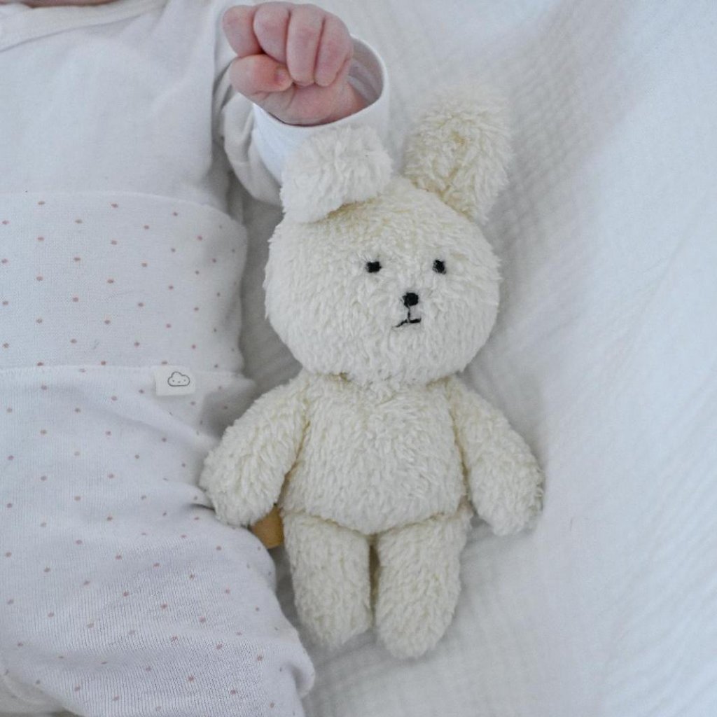 Príjemný a hebučký baranček, nohy a ruky sú ušité z jedného kusu, rovnako ako celá postava, tvárička je ručne vyšitá bavlnou, aby nedošlo k oddeleniu niektorej z častí.