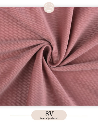 Velvet je velkým hitem, zejména pro svou dokonalou hebkost a luxusní vzhled. Je vyroben ze 100% polyesteru a díky svým vlastnostem je ideální do chladnějšího prostředí, proto jej doporučujeme zejména na vnější materiál výbavy.